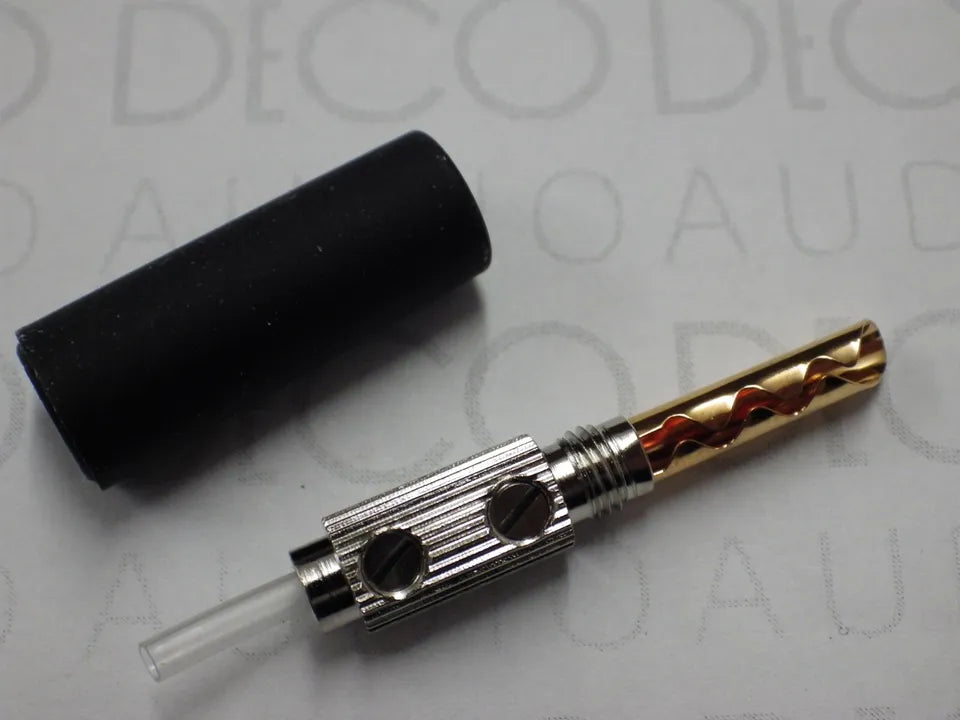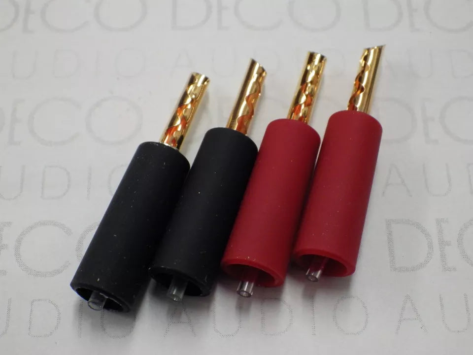 Made from flexible but highly conductive beryllium copper, these low mass plugs are a great connector suitable for use into both 4mm sockets and also BFA/Camcon sockets. The springy nature of the metal means they always make a nice tight fit for the best contact. They are a screw type design, with two screws to get a good connection onto the wire (please note the clear plastic tube that is shown in the pictures is there purely to stop the screws from falling out in transit).