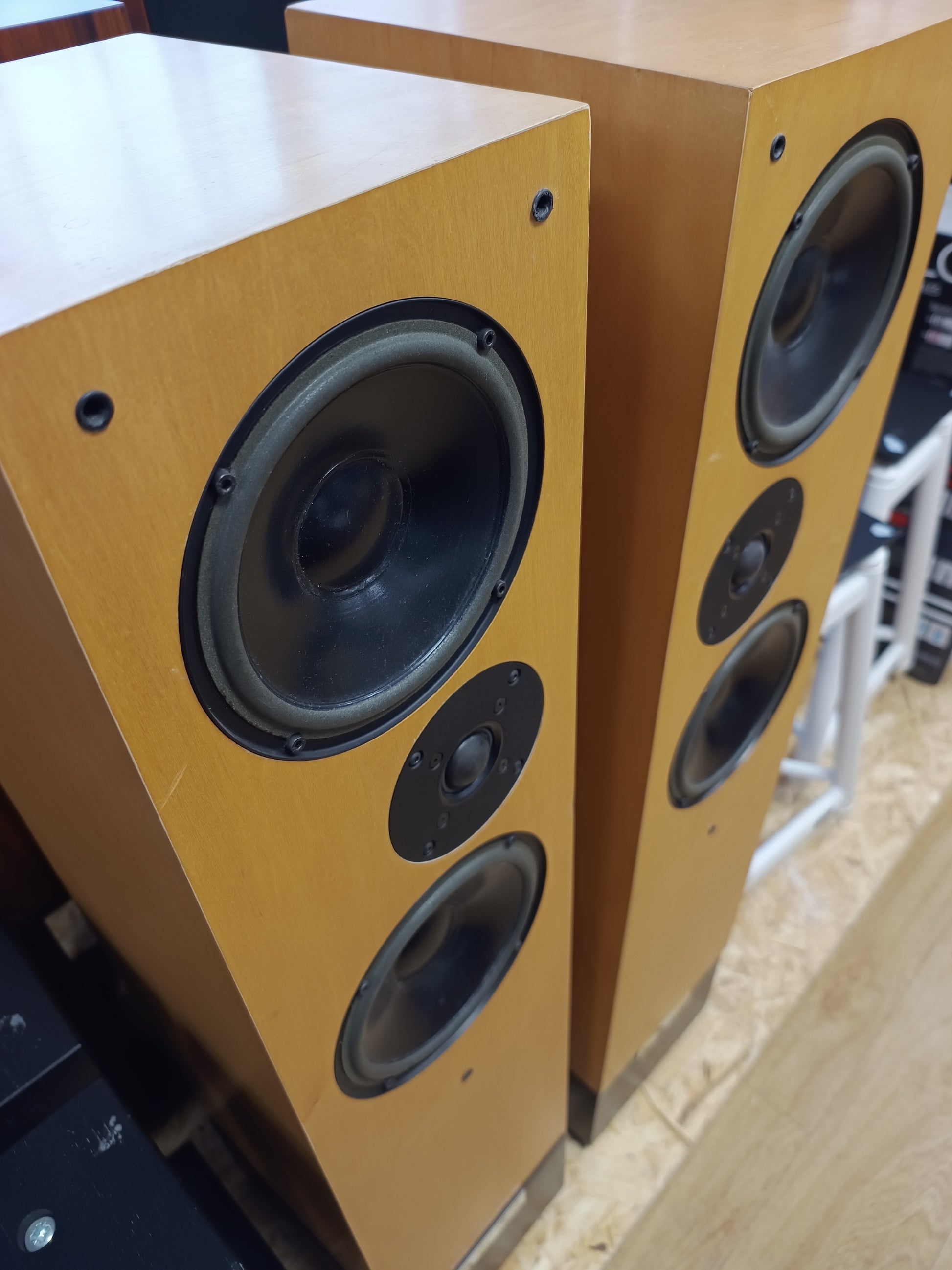 This is a cosmetically battle scarred pair of fairly early Avatar speakers. The Maple veneered enclosures have lots of marks on them, primarily from the grilles during shipping at some point. The speakers do not have grilles, they do have boxes but due to the lack or the grilles we would prefer not to ship them as it could potentially damage the drive units.