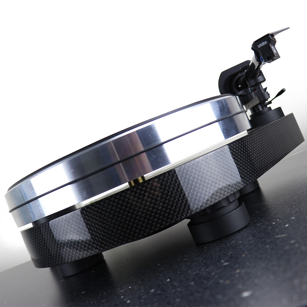 Thanks to extensive research and development, we´re now lift our classic RPM design to an even higher level. The RPM 9 Carbon uses a new extraheavy chassis. It features a special CNC-machined MDF base with resin-coated steel pellets to form an extra-heavy and precise sandwich construction. A special complex heat treatment and carbon surface coating ensures superior low resonance levels. The mass-loaded chassis is effectively decoupled from its surface using magnetic feet. Combined with a new special polished aluminium platter with internal TPE damping and a vinyl layer on top, the inverted ceramic main bearing delivers an absolutely stable turntable speed with extra-low rumble. The heavy outboard motor unit is equipped with precise motor control and features a built-in switch between 33 & 45 RPM. Last but not least; the non-compromise 9“ Evo tonearm with conical carbon-fibre arm tube and inverted bearing design ensures perfect tracking, even with demanding cartridges. Highly flexible top-grade copper internal wiring is used. Delivered with top-grade 5P phono cable ´Connect it CC´ with RCA plugs (XLR as an option).