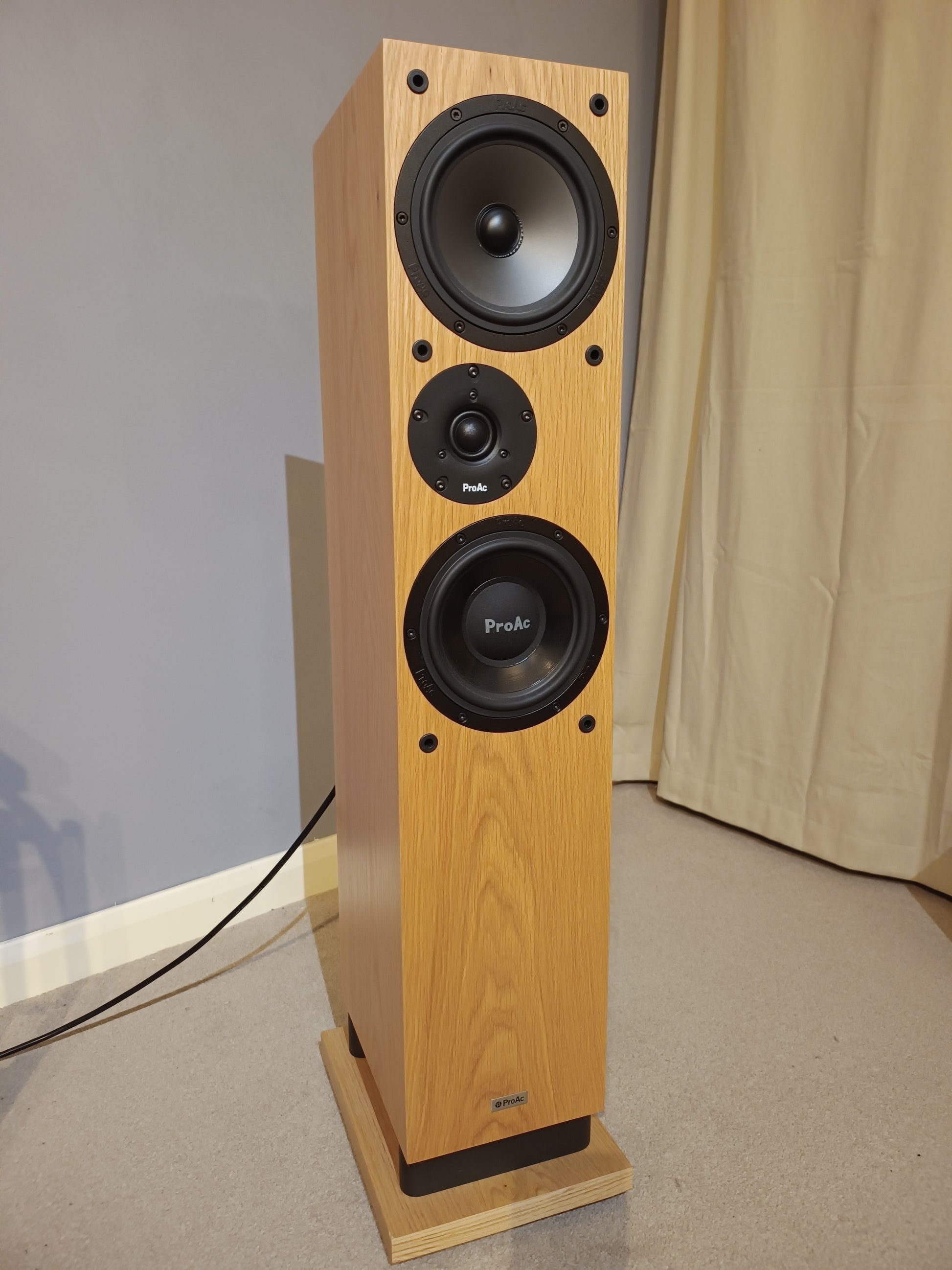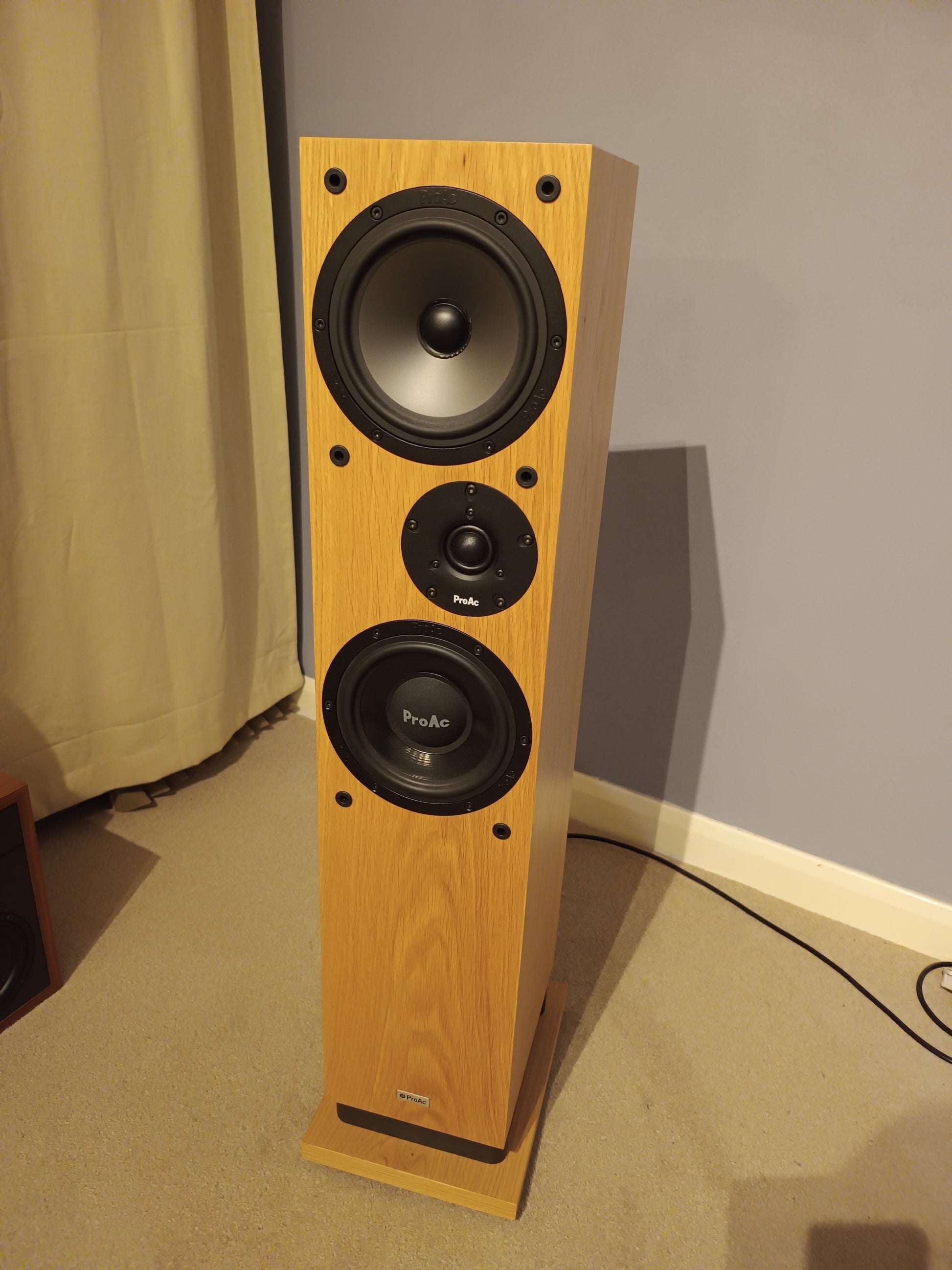 This is our ex demonstration pair of DT8 speakers by ProAc. They are finished in the Oak real wood veneer and we're only looking to move them on to change to a different colour for a bit of variety.