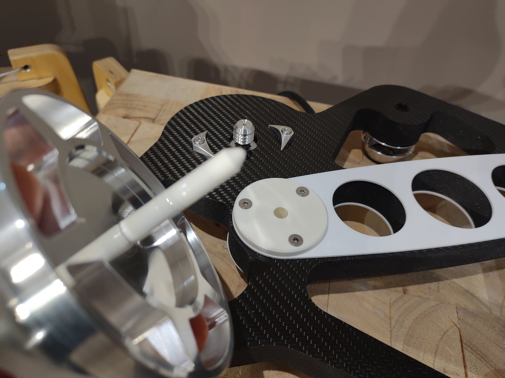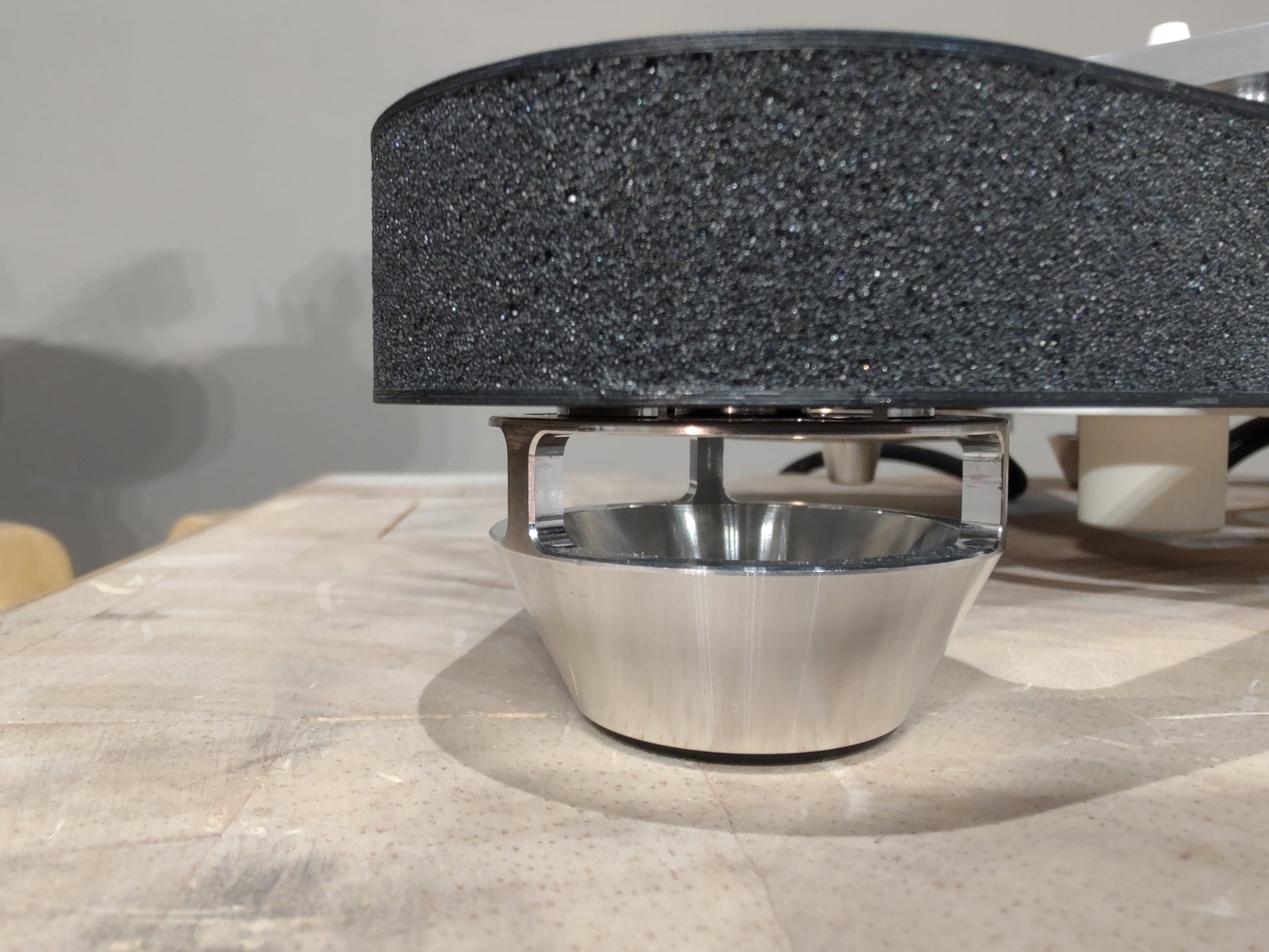 The main bearing itself is fascinating, it's made from a ceramic material (ZTA Zirconium toughened alumina ceramic to be precise), upon its sits the most beautifully sculptured aluminium sib platter and upon that is a platter made from diamond cut Ceramic Oxide, and eye wateringly expensive material to use for this sort of application. In its design is has a flywheel profile to increase mass as its perimeter.