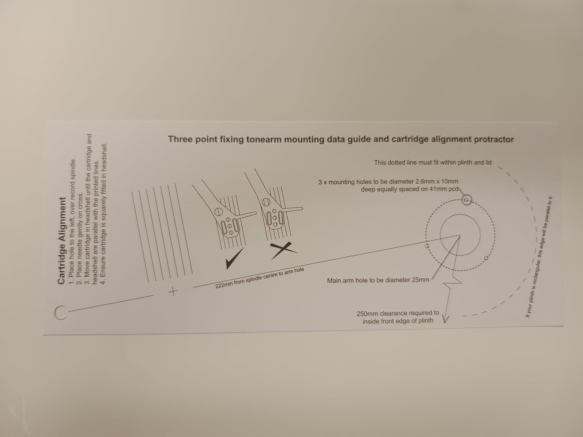 It features the current 3 point Rega fixing, where three wood screws (included) are used to secure it to the plinth/armboard. The main arm hole is 25mm diameter, with the three securing the arm in a triangle around this central hole. M3.5 nuts and bolts can be used for metal armboards (not included). A manual and mounting protractor are included.