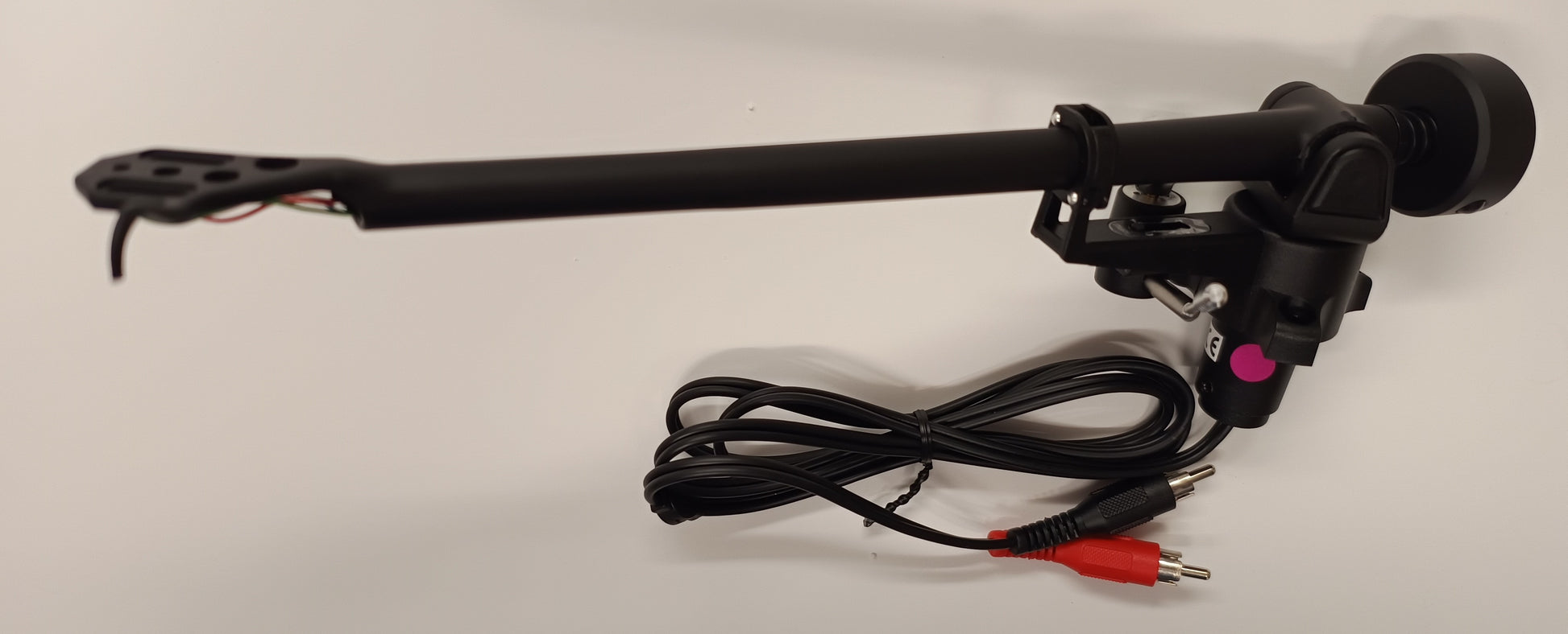 The external cable is captive (soldered inside the arm to reduce the number of contacts in the signal path), it is approximately 1.1m in length and is terminated with RCA plugs, no additional ground wire is required. The cable is well screened and low capacitance making it suitable for use with all cartridges.