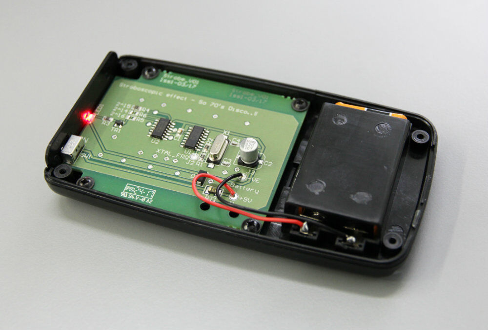 The hand-held strobe unit generates a 100 Hz pulsed light source for use with the supplied 180-line stroboscopic disc.