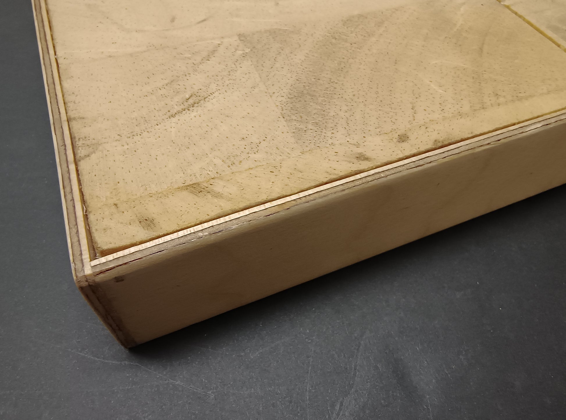 That means that here there are four layers to the design instead of two, on the top is a layer of end grain balsa wood, then beneath it is bonded to a thin plywood layer, then another balsa layer and finally another thin plywood layer as the base. This is all wrapped in a plywood cosmetic trim that covers the edges.