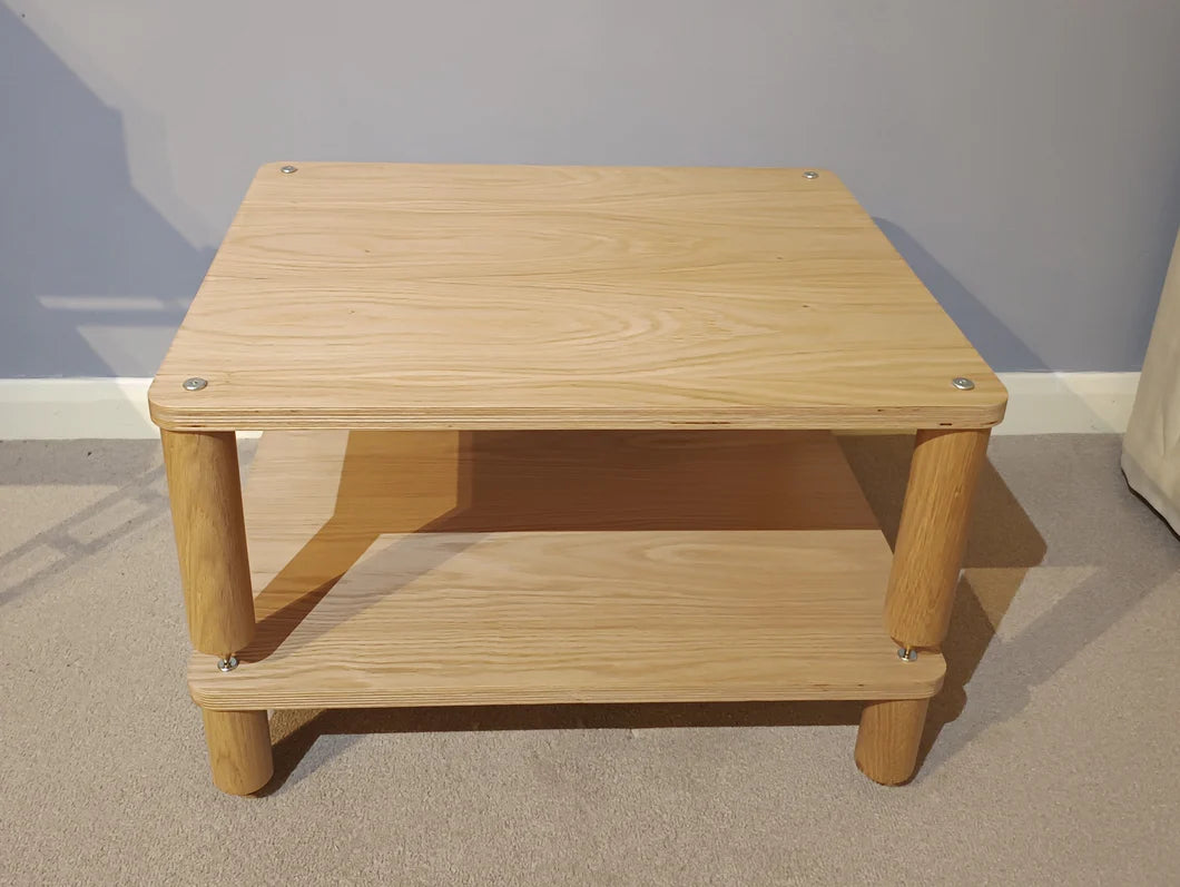 Key to this is material choice, we auditioned various options and elected to use a mixture of real Oak veneered Birch plywood shelves combined with turned solid Oak columns.